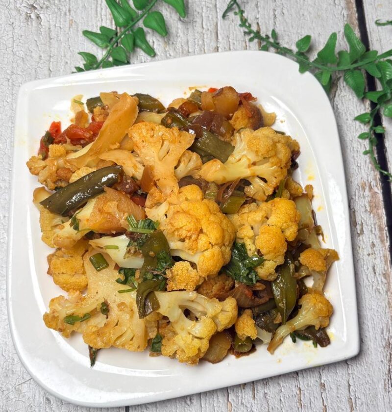 🍽️ Your stir-fried cauliflower, hyacinth beans, and potato bhaji is ready to serve!